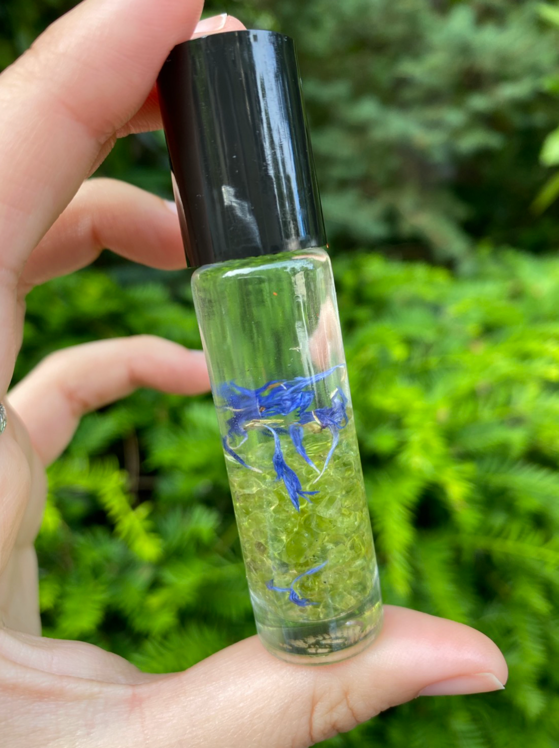 Ingredients: fractionated coconut oil, essential oils, fragrance oils, peridot, cornflower petals